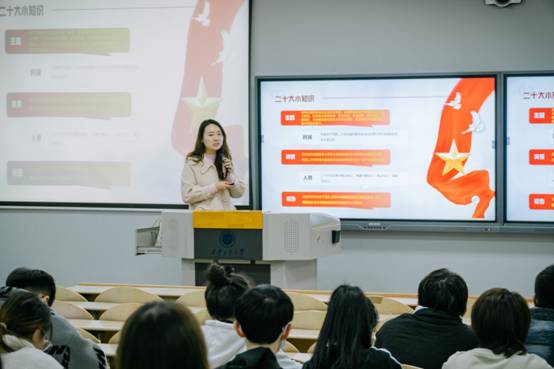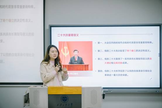 许格宁老师首先向同学们讲述了有关党的二十大的基本知识及其重要意义,带领大家细读了报告中的重点关键词,为同学们讲解了党的中心任务,并从“五位一体”总体布局和“四个全面”战略布局的角度详细深入的进行了阐述。其次,许老师结合二十大报告中有关教育、科技、人才的内容,给大家讲明白了科教兴国战略为什么如此重要、现代化建设为什么需要人才支撑,激发了同学们将个人前途命运和国家战略目标相结合的信念,进一步坚定了大家青春报国之志。许格宁老师最后寄语同学们说:“作为一名新时代青年,需以志为先、需以新为径、需以苦为食,要以青春之名,争取跑出当代青年的最好成绩。”