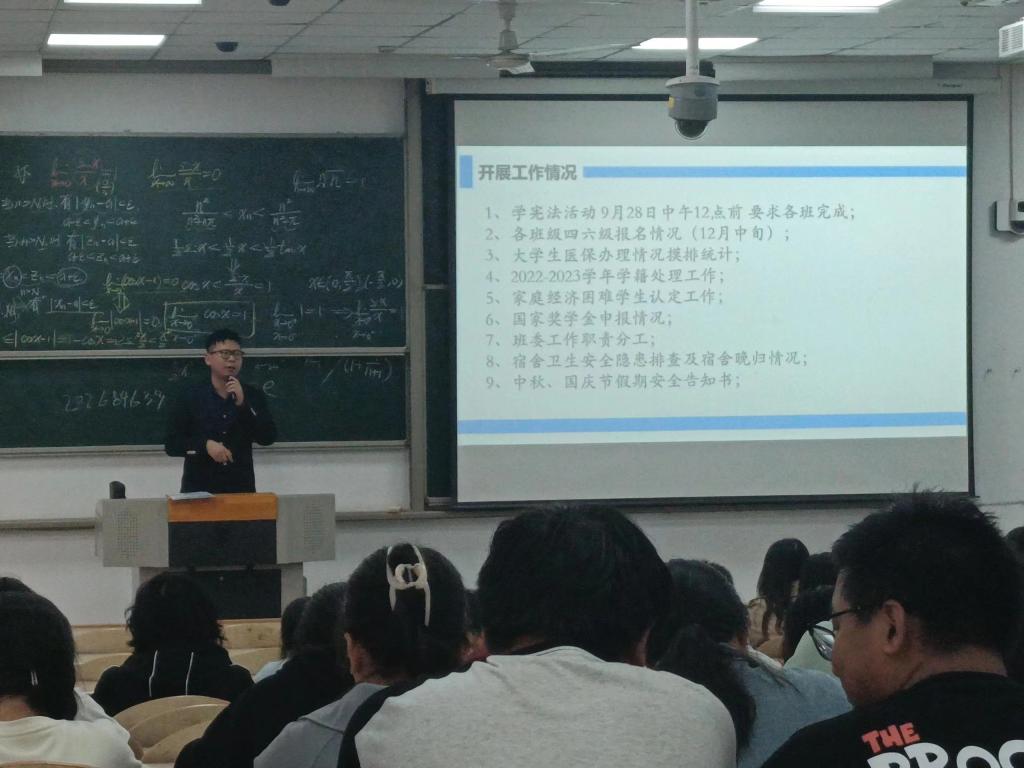 辅导员孙君首先就9月份开展的重点工作在会上进行通报。包括开展学宪法活动;四六级报名情况、老员工医保办理情况摸排统计;2022-2023学年学籍处理工作;家庭经济困难员工认定工作布置;班委工作职责分工;宿舍卫生安全隐患排查及宿舍晚归情况逐一进行公布。