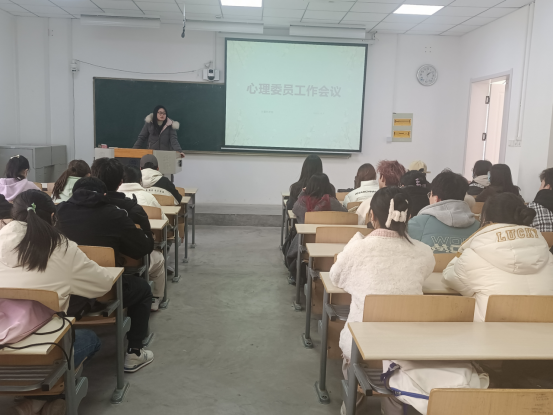 王梦馨老师首先讲述了心理委员的工作职责,表示心理委员在班里应做好心理健康知识的宣传与教育工作,通过班级活动和日常的关注给予心理有困惑的同学疏导和帮助;随后王梦馨老师就老员工心理健康的知识向在场的心理委员做了讲解,从老员工心理健康的标准、心理问题的识别与应对两个方面入手,向心理委员们科普了老员工常见心理问题类型、症状及识别心理问题严重程度的方法和判断标准;最后王梦馨老师强调到,班级心理委员应随时关注班级同学的心理健康状况,如班级同学出现异常状况,一定要及时告知辅导员老师。