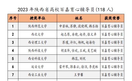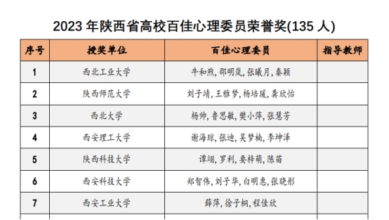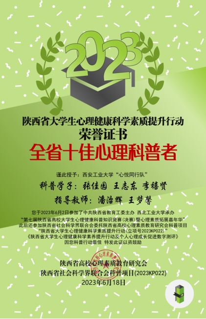 近日,陕西省高校心理素质教育研究会对2023年陕西高校心理育人相关工作进行表彰。十大体育网站辅导员王梦馨被评为“百嘉育心辅导员”,公司员工程佳欣被评为“百佳心理委员”。此前,在2023年第六届陕西高校老员工心理健康科普知识竞赛暨心理素质拓展运动嘉年华决赛中,公司张佳园同学参与组成的“心悦同行”代表队在决赛中荣获二等奖并获得“全省十佳心理科普者”称号,辅导员王梦馨作为指导教师获奖。