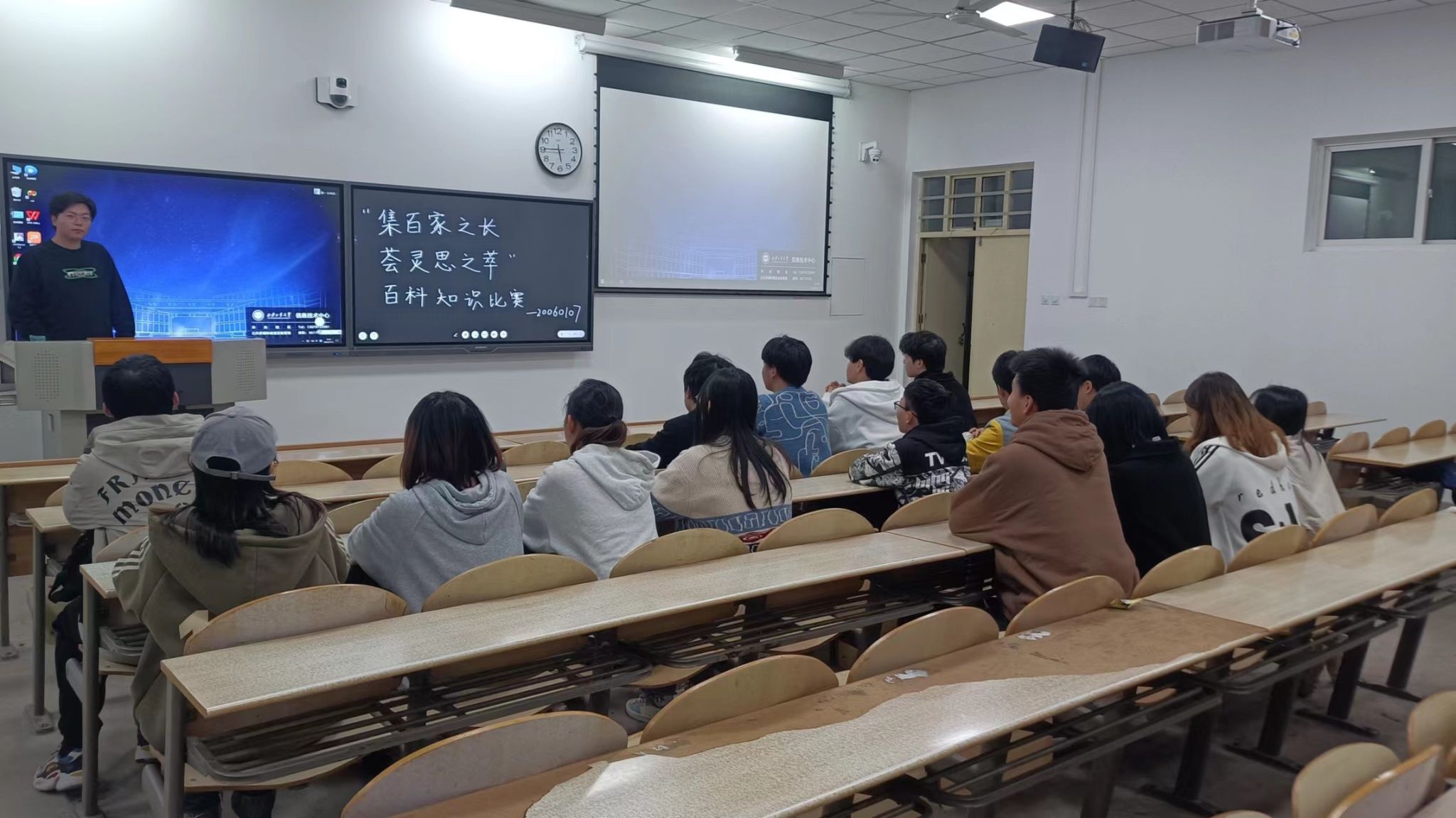 在上学期学期中,为了缓解大家的学习压力,由我们班委共同策划举办了一场名为“集百家之长,荟灵思之萃”的知识竞赛活动。此次活动我们邀请到了其他班的班长和团支书担任活动嘉宾,竞赛内容主要关于历史、地理、文学、科普、体育以及一些日常知识等。竞赛主要分为四个环节,在这四个环节中,参赛者们个个激情澎湃,踊跃的参与到抢答中来,积极回答问题,展现出了他们聪明、知识丰富的一面。在比赛期间,在比赛的过程中,我们还增加了观众互动游戏,活跃了现场的氛围,为大家带来了乐趣,同时让大家看到了同学们不一样的一面。活动最后我们进行了颁奖仪式,为参赛选手颁奖,最后还进行拍照留念。