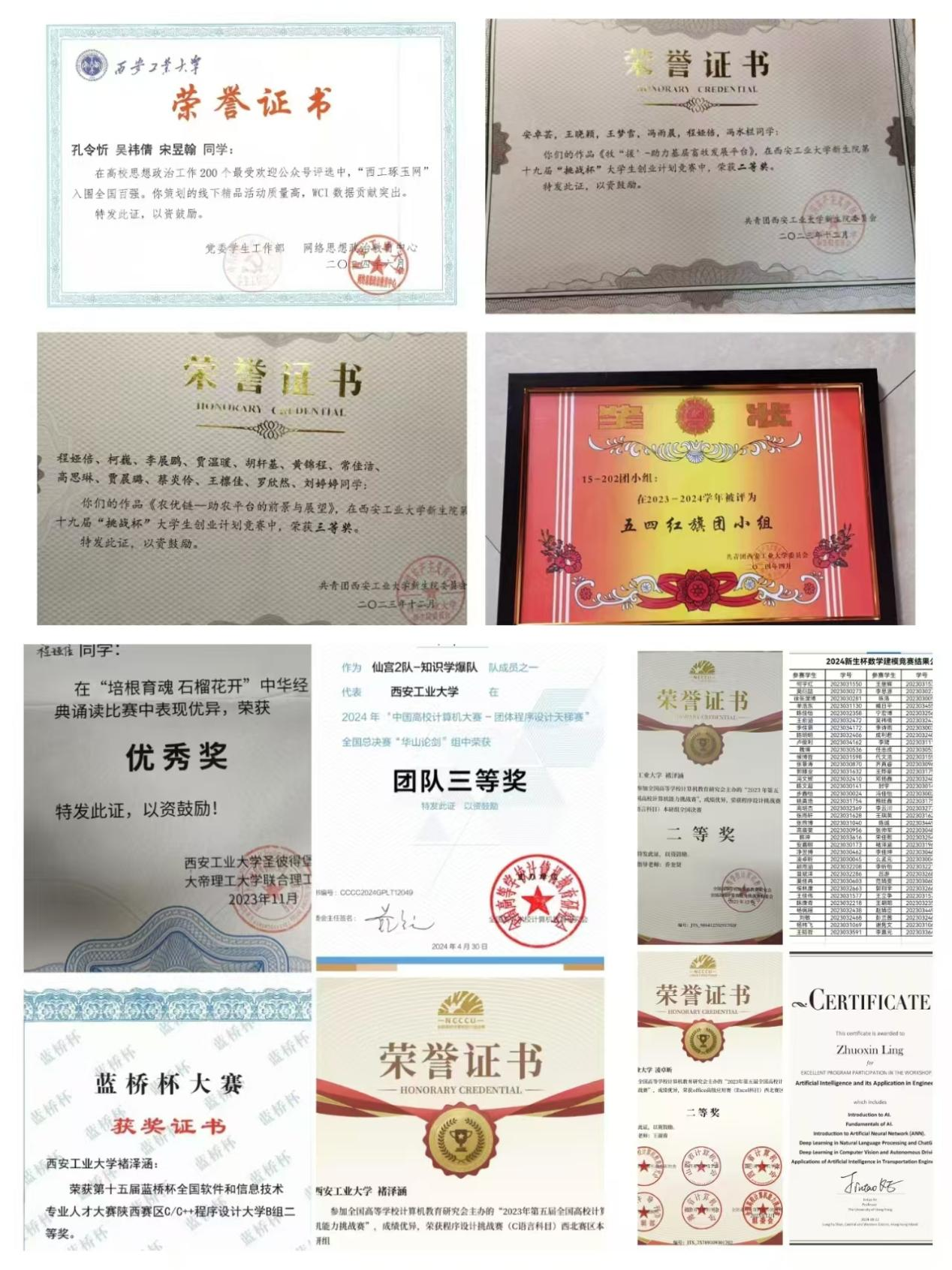 1.icpc校内选拔赛一等奖,校内第三 2.第12届陕西省老员工程序设计竞赛正式赛优胜奖 3.计挑赛c++赛项国二 4.天梯赛团体国三 5.新生院非计算机组程序设计一等奖,非计算机组并列第一 6.全国老员工程序设计大赛一等奖 7.天梯校赛一等奖 8.竞赛之星 |