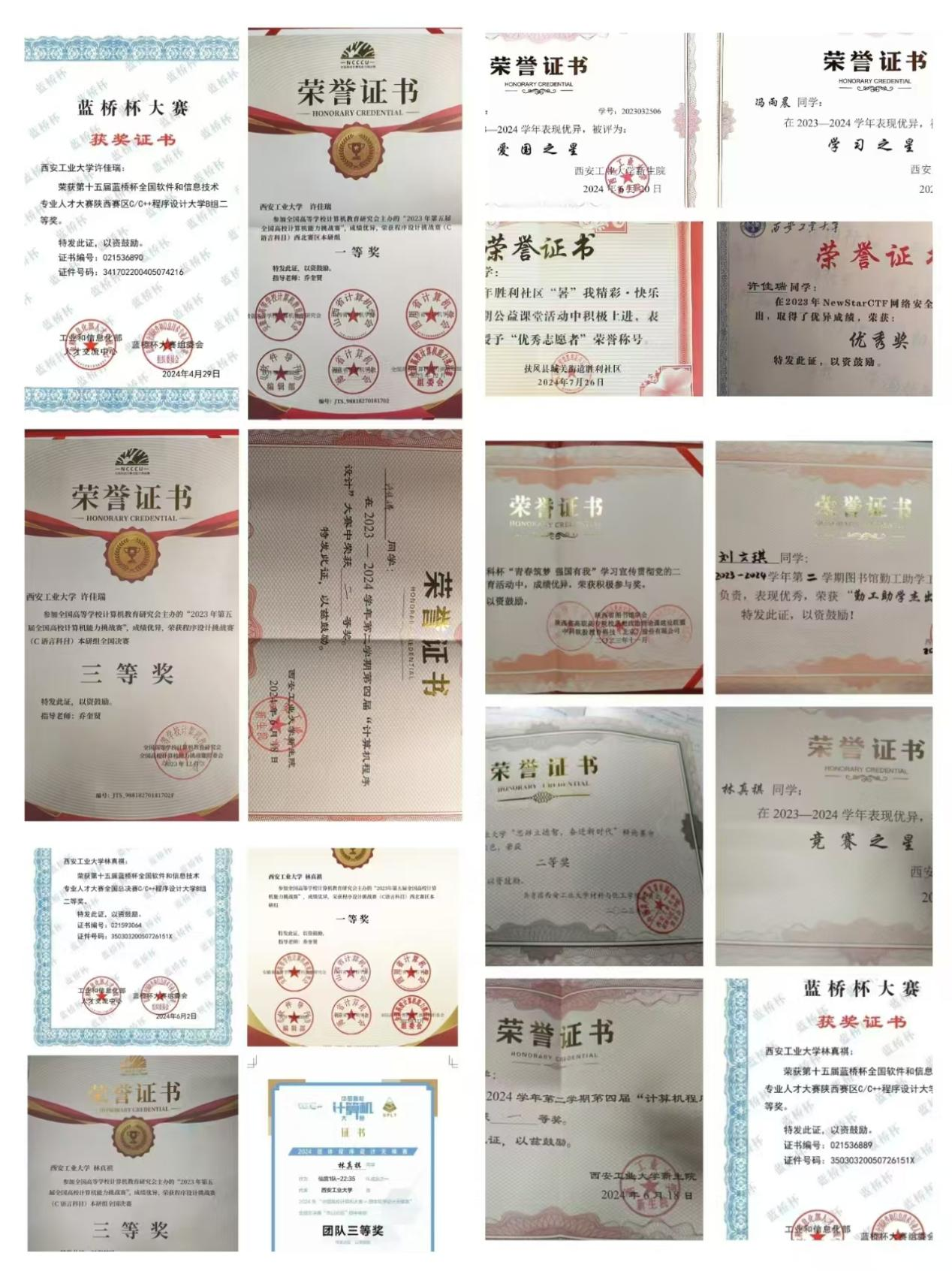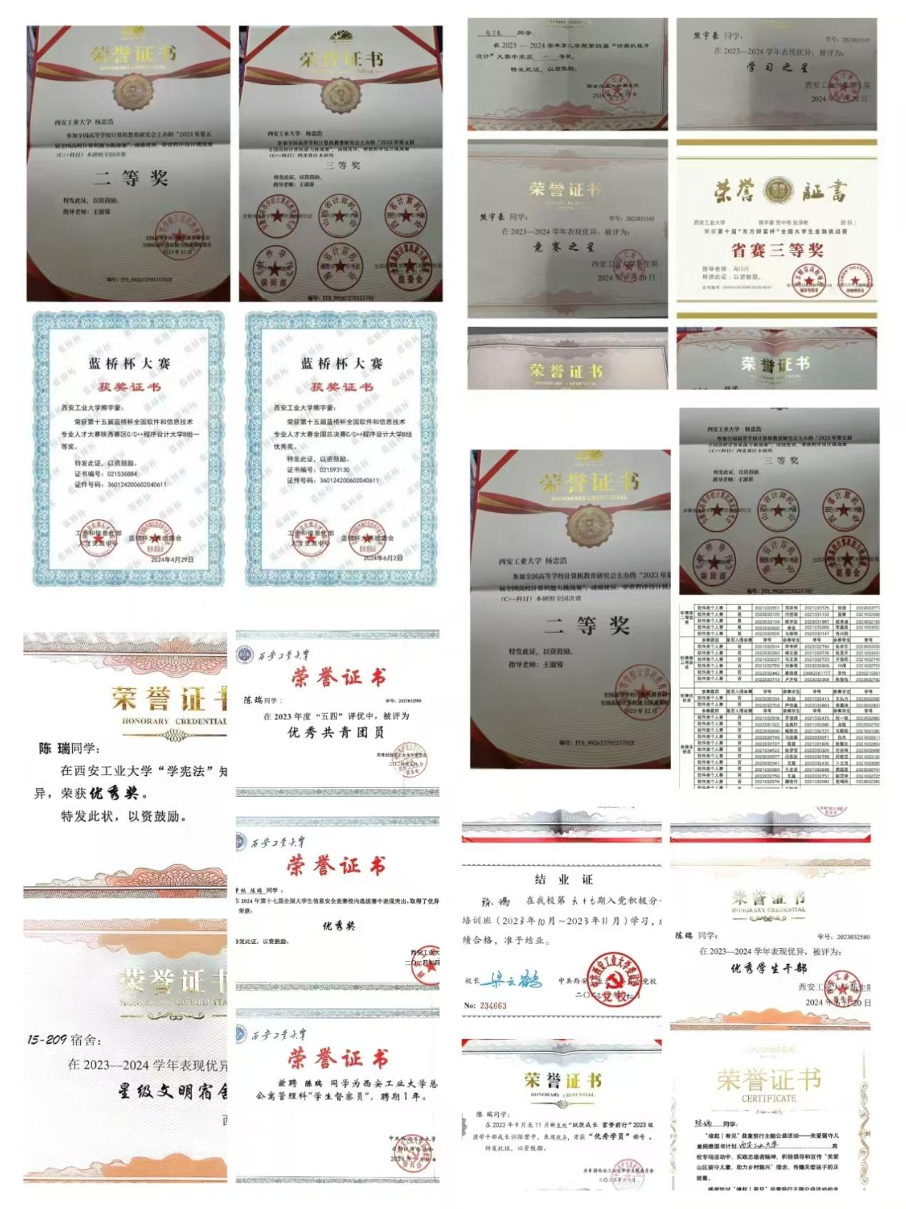 1,蓝桥杯省赛一等奖 2,蓝桥杯国赛优秀奖 3,全国高校计算机能力挑战赛国赛三等奖 4,全国高校计算机能力挑战赛省赛一等奖 5,全国老员工程序设计大赛全国一等奖 6,acm-icpc校赛三等奖 7,蓝桥杯校赛二等奖 8,新生院程序设计竞赛非计算机组一等奖 9,算法大赛新生组一等奖 10,算法大赛高年级组优秀奖 11,竞赛之星 12,学习之星 |