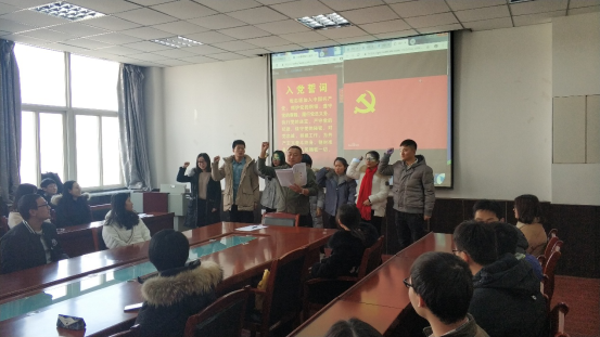 会议最后,在党徽下,高金生老师带领新入党和转正的同志们庄严宣誓!随时准备为党和人民牺牲一切,永不叛党!
