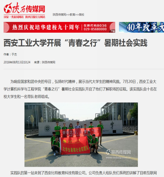 8月13日,陕西传媒网以《十大体育网站开展“青春之行”暑期社会实践》为题,报道了公司计算机科学与工程公司“青春之行”暑期社会实践队响应国家和团中央的号召,紧扣时代主题,围绕创新创业积极开展的实践活动。由来自公司计算机科学与技术等专业的10名优秀员工组建的实践队伍利用暑期在西安市进行了有关创新创业的社会实践活动,受到西安比特教育科技有限公司和西安广联达科技股份有限公司的好评,得到了媒体的关注。