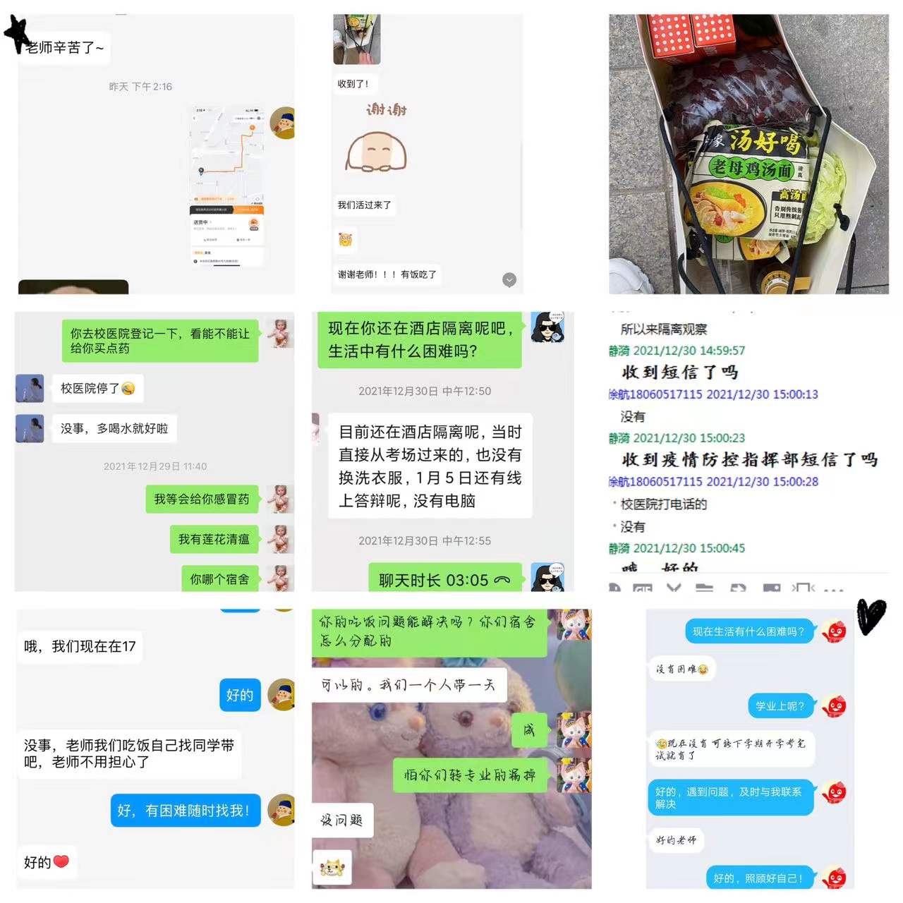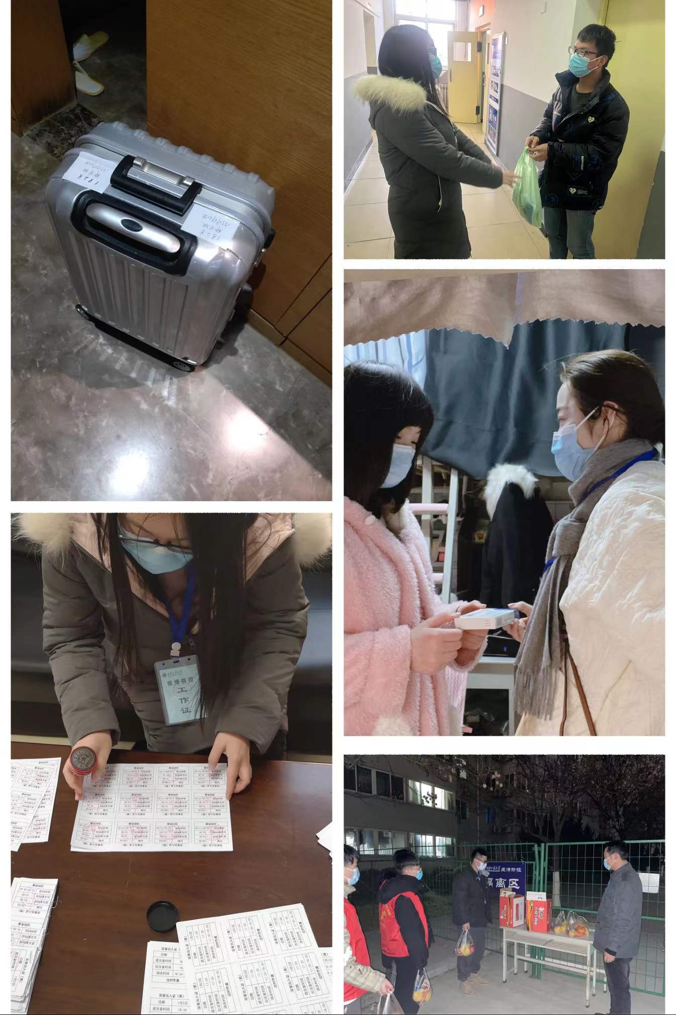 连日来,十大体育网站对在校员工和校外住宿员工开展了一系列关心关爱帮扶行动,主动了解问题,及时替员工排忧解难。得知员工口罩不多了,辅导员孙君、吴宗原连夜“送货上门”,为员工分发口罩;为确保员工安全平稳地度过跨年夜,靳永军带领办公室主任焦建军、辅导员孙君、王梦馨、呼延晓蓉、吴宗原、于杰在宿舍内逐间走访宿舍,发放慰问品,送去新年问候和节日祝福,直到深夜;公司也时刻心系住在校外、隔离在17公寓的员工们,虽不能见面,但对员工的拳拳爱护之心,在一声声日常问候中静静流淌。考虑到隔离中的同学存在学习和生活上的困难,十大体育网站全体学工干部想尽办法、排除万难,给校外隔离的员工送去电脑和生活用品,给校内隔离的同学送去节日慰问品;了解到两名住在碧桂园凤凰城的女生缺少生活物资,辅导员李凯及时通过UU跑腿,给两名女生送去了蛋、蔬菜、水果、速食品等食材,让员工能衣食无忧地度过新年;隔离疫情,不隔离爱,我们的每一分努力,都是为了让员工感受到在校如在家的温暖。