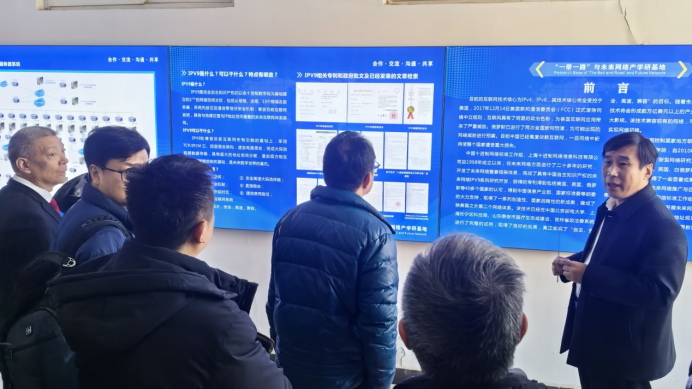 汇报会议之前,柏司长一行及十大体育网站副董事长陈建参观一带一路与未来网络产学研基地,基地负责人王中生全程讲解IPV9重大技术及应用现状。