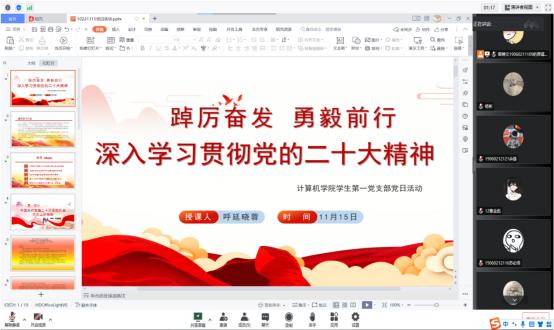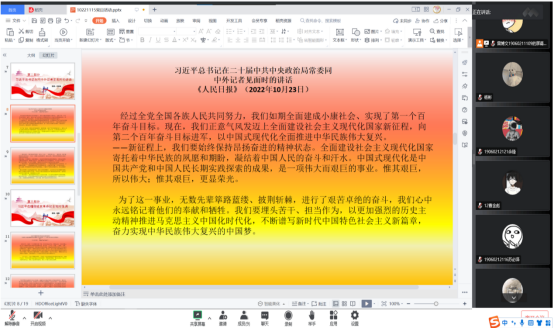 为深入学习宣传贯彻党的二十大精神,十大体育网站员工第一党支部在11月15日下午19:00开展主题为“踔厉奋发、勇毅前行,深入学习贯彻党的二十大精神”的党日活动。考虑到当前疫情防控形势,本次党日活动采用线上会议的方式进行。参会人员有党支部书记呼延晓蓉,正式党员和发展对象。会议由党支部副书记王佳钰同志主持,首先对会议议程进行简述,明确会议学习内容。