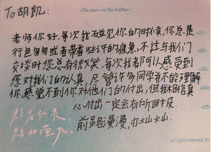 您总是让我感动。您不仅会传授专业知识,还时常关注我们的心理健康和生活状态。在我感到压力和迷茫的时候,您总是会开导我、鼓励我,并给我提供实际有效的帮助。您像一盏明灯,为我照亮前行的道路。我很感激您的指导和关怀,这些都让我更加坚定了自己的目标和信念。