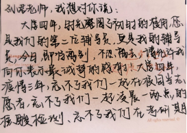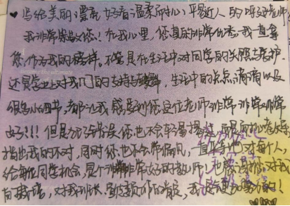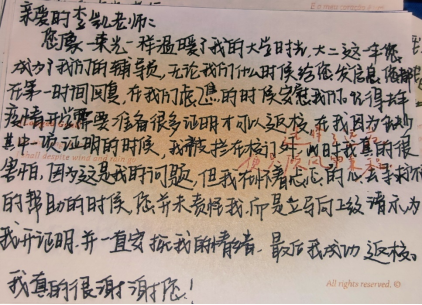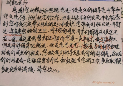 您像一束光一样温暖了我的大学时光,大二这一年您成为了我们的辅导员,无论我们什么时候给您发信息,您都在第一时间回复,在我们焦虑的时候安慰我们,记得去年疫情开学需要准备很多证明才可以返校,在我因为缺少其中一项证明的时候,我被拦在校门外,此时我真的很害怕,因为这是我的问题,但我在怀着忐忑的心去寻找您的帮助的时候,您并未责怪我,而是立马向上级请示,为我开证明并一直安抚我的情绪,最后我成功返校,我真的很感谢您!