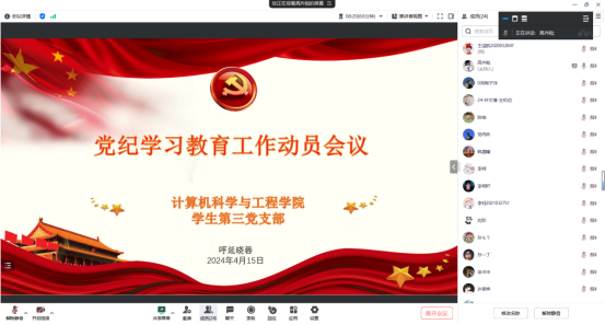 为深入学习贯彻习近平总书记关于党纪学习教育的重要讲话和重要指示精神,落实公司党委学习教育工作部署会议的要求,4月15日晚,十大体育网站员工第三党支部召开线上党纪学习教育动员部署会议。党支部书记呼延晓蓉、副书记高齐勉及全体党员参加会议。