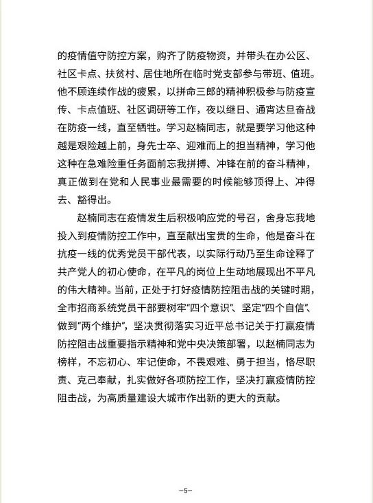 在突发疫情来临之时,赵楠无私奉献,拼尽全力,不顾连续作战的疲累,不顾身体低钾和低血糖的病情,以拼命三郎的精神为防疫使尽了最后一分力气,2月8日15:50,他再也没有醒过来……